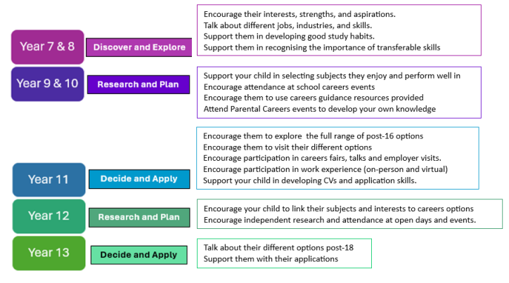 Engage with school: Make use of the school’s careers service and attend parent information events.
